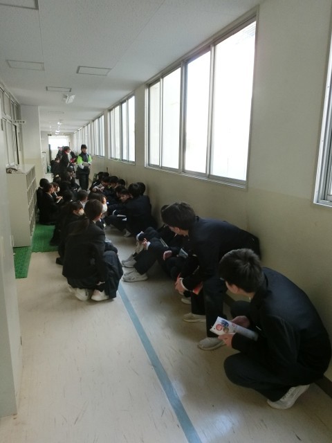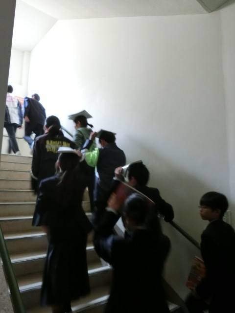 次に津波を想定した訓練では、頭上に気を付け、グランドから校舎の3階と4階に避難しました。