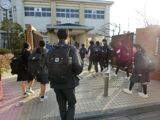 朝の登校風景です。本日は2年生は校外学習があります。体育館に集合しています!