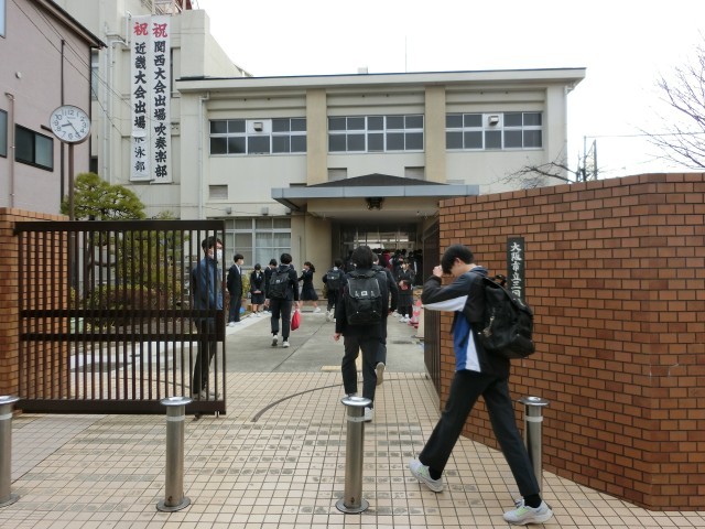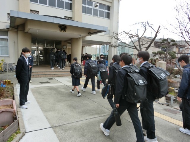 朝の登校風景です。本日2年生は調理実習があるため学年集会はありません。