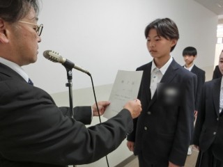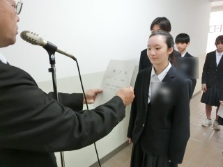 修了証の授与。 2年生、1年生の男女委員長代表に修了証を授与いたしました。