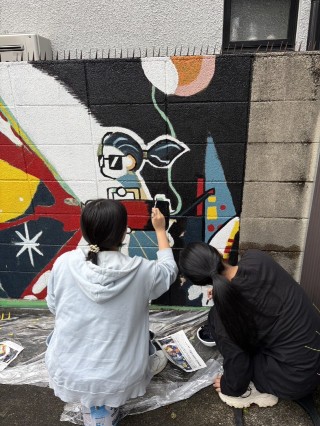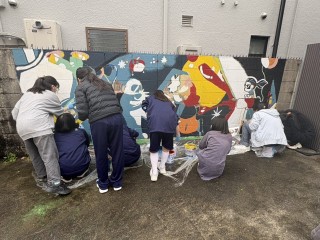 新高連合防災倉庫の壁面制作、本日も美術部が頑張っています。