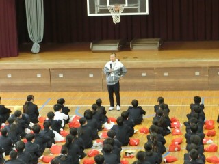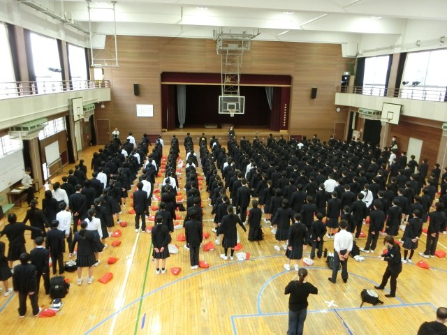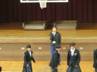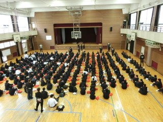 1年初めての学年集会です。学年主任の先生から挨拶・服装・学校生活の過ごし方についてのお話がありました。