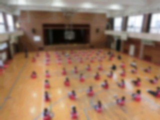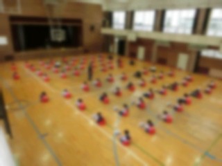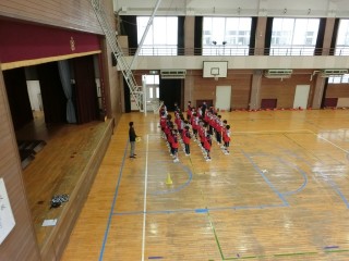 しっかりと準備運動、ストレッチしてます。号令の声に合わせて大きな声で返事しています。まずは集団行動です。