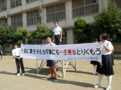 生徒会長からは、2学期の目標について報告がありました。目標「行動に責任をもち何事にも一生懸命とりくもう」は、本校の正門に掲示しています。