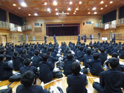 本格的に学習活動がスタートしました。本日は終日オリエンテーションを実施しました。学級写真撮影に始まり、発育測定、学年集会、学級活動と盛りだくさんの内容でした。また、1年生を迎えて初めての給食を、全校生徒がいっせいに食堂でとりました。生徒たちが楽しそうに会話しながらほおばる姿が印象的でした。放課後は部活動紹介。各部が趣向を凝らしたパフォーマンスを披露し、自分たちの部への入部を働きかけました。その後、早速1年生は部活動体験入部に臨み、顧問の指導のもと練習に臨みました。部活動は今週中の体験入部を経て、次週から正式入部の運びとなります。