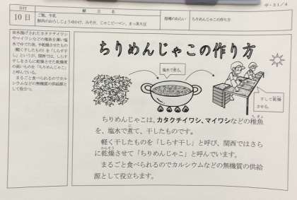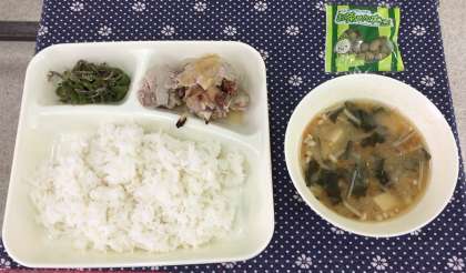 4月10日(水)、今日の給食の献立は『ごはん・牛乳・豚肉のおろしじょうゆかけ・みそ汁・じゃこピーマン・まっ茶大豆』です。