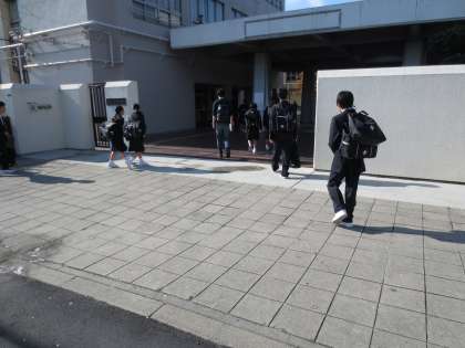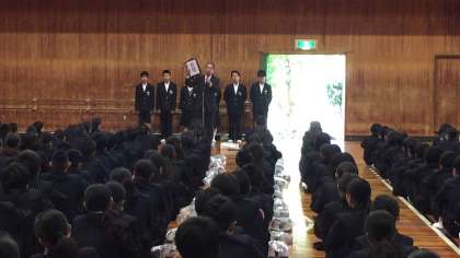 昨日とはうって変わった晴れ渡る青空のもと、生徒の皆さんが登校してきます。1週間の始まりにふさわしい朝です。毎週月曜日は体育館で全校集会が行われるので、普段より余裕をもって登校してくる生徒も見かけます。体育館では、壇上側を正面にすると全校生徒が収容できません。そこで、北側(十三筋側)を正面にして整列します。司会進行は生徒会がリードします。各部活動の表彰に引き続き、校長先生のお話(本校の校訓のついてのお話でした)、最後に生徒会役員から今週の主な予定について説明がありました。