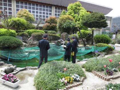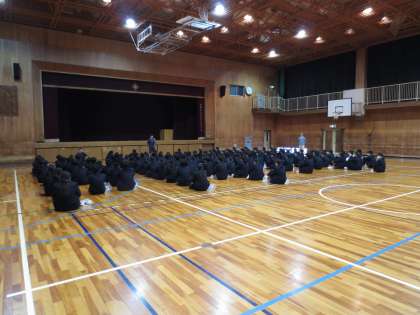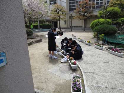 上段は始業前に行われた1年生学年集会の様子です。毎週水曜日は1年生、木曜日は2年生、金曜日は3年生の集会が体育館でもたれます。今日は学年目標『◎学習(中学生の本分)に一生懸命に取り組む◎思いやりの心で一人ひとりの違いを認め合う◎ルールを守る』についてお話しがありました。中段・下段は、1年生理科の授業の様子です。校庭で植物・動物(本校にはたくさんのコイがいます。)の観察に取り組みました。気づいたことや疑問に感じたことについてノートに記録し、考察を深めました。