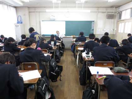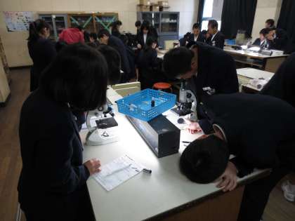 上段は理科の授業です。オオカナダモ、タマネギ、ヒトの皮膚の細胞を酢酸オルセインで染めた前後に顕微鏡で観察し、違いや変化に注意しながら考察を深めました。中段は国語の授業です。文学的文章「小さな手袋」を教材に、主人公シホとおばあさんの交流を中心に登場人物の言動の意味について考え、内容理解に努めました。下段は美術の授業です。15種類の詩があらかじめ提示され、自分が選んだ詩のイメージをもとに画用紙に鉛筆で絵を描きました。