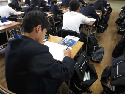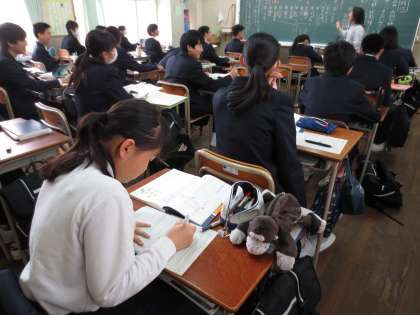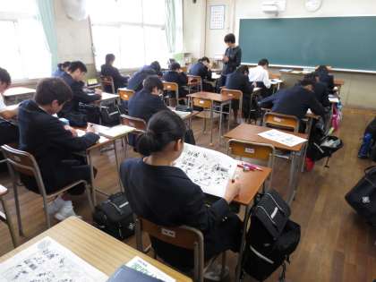 上段は、3年生国語の授業の様子です。詩「水のようなひと」を教材に比喩表現について学んだのち、「自分自身を○○に例えると…」という文章の作成に取り組みました。中段は家庭科の授業の様子です。「家庭内事故を防ごう」というプリントが配布され、階段での転倒やクローゼットでの指づめなど、日常想定される危険に関して、その防止策を皆で考えました。下段は数学の授業の様子です。多項式の乗法について原則を学んだのち、演習問題に取り組みました。