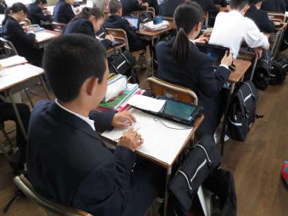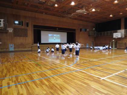 上段は保健体育の授業の様子です。生徒6人で班を構成し、体育館舞台上にある大型スクリーンに映し出されたラジオ体操の模範演技を見ながら、一つひとつの動作を確認しました。この後、3人ずつ演技を披露し、残りの3人が各生徒の出来ばえをチェックしながら振り返りを行いました。中下段は英語の授業の様子です。タブレット端末を用いて自ら検索した写真等を背景に、あらかじめ作成した英文をもとに自己PRを行いました。英語の授業でも態度や声の大きさなどを生徒が相互に評価していました。