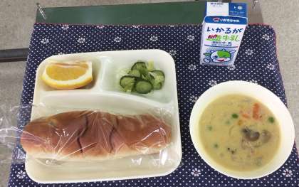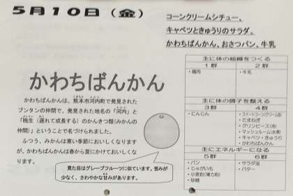 5月10日(金)、今日の給食の献立は、『パン・牛乳・コーンクリームシチュー・キャベツときゅうりのサラダ・かわちばんかん』でした。