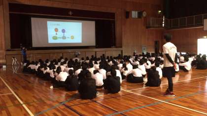5月13日(月)5限、1年生は、本校体育館で、パワーポイントを活用して『いじめについて考える日』の取り組みを行いました。