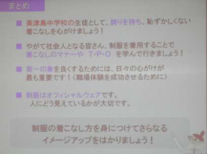 中学校の制服が、オフィシャルウエアーであるということ。制服を着用することで自分たちが一つの集団に所属しているということ。そして、それによってある意味では、自分たちが守られているということ。などについて学習しながら、その制服を美津島中学生として誇りを持って、TPOを理解し、正しく着こなすことが大切である。ということについて学びました。