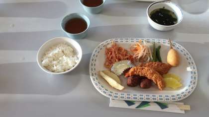 海のプログラム終了後も、特にケガや体調不良を訴える生徒はおらず、皆元気に活動しています。さて入浴のあと、全員で夕食をとりました。メニュー(左側の写真)は、「白身フライ・エビフライ・ミートボール・タルタルソース・インゲン塩ゆで・ミニアメリカンドック・パイナップル・もやし・ニンジン胡麻和え・ごはん・わかめスープ」です。