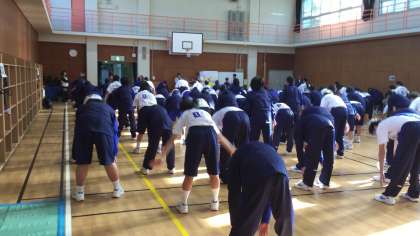 6時20分に起床し、2日目の活動が始まりました。ベッドの毛布をきちんとたたみ、身の回りを片付けたあと、体育館で『朝の集い』を行いました。生徒代表の朝のあいさつに引き続き、各クラスの体育委員の模範演技のもと、皆でラジオ体操を行いました。保健委員の健康観察に、体調不良を訴える生徒はおらず、みんな元気に活動中とのことです。先生方から諸注意・諸連絡を受けて、『朝の集い』は終了。この後、7時30分から朝食をとる予定です。