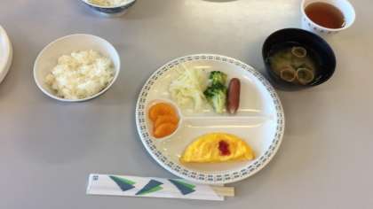 食堂で朝食です。メニューは「プレーンオムレツ・あらびきウィンナー・ブロッコリー・キャベツ・ミカン・みそ汁」です。