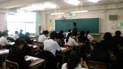 写真は3年生実力テスト(2限社会科)の開始直前の様子です。問題配布を終え、監督の先生が教室の時計をもとに「始めてください」の合図をかけようとしています。3年生の皆さん、最後まで頑張ってください。