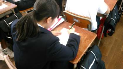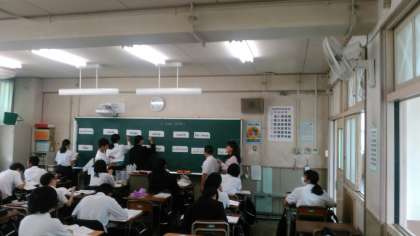 2年生英語の授業の様子です。授業の初めは単語小テスト。前時に習った単語について、担当教員の発音に倣って読みと綴りを再確認した後、5分間のテストに臨みました。本日の単元は『〜のように見える』。主語+looK+〜の表現について、主語の人称、また3人称であれば単数なのか複数なのか、さらに現在形・過去形の違いにも留意しながら、動詞lookの変化について確認を行いました。最後に本日の単元の新出単語の意味を挙手した生徒が黒板に書いてクラスで共有した後、本文の読みを確認し授業を終えました。