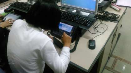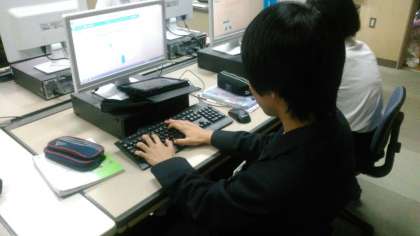 本日3限の3年技術の授業の様子です。前半はタイピングの練習。パソコン室備え付けのパソコンにインストールされたコンテンツを活用して、キーボードを用いてタイピングの練習をしました。画面に現れた簡単な日常会話をローマ字で打ち、画面上で日本語に変換します。速さと正しさが、画面上で10点満点で表されるので、みんな真剣そのものです。後半はタブレットを用いて、自動販売機やルームクーラーなどのプログラミング機器の情報処理の手順について、フローチャート図を描いて考察を深めました。