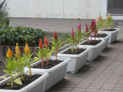 緑化活動の一つとして、淀川区役所の夢ちゃん事業で育てているケイトウとサルビアの苗を分けていただきました。本校の正面玄関のプランターに管理作業員さんに移植していただきました。