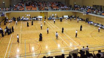 上段の写真は陸上競技の部(長居第二競技場)、下段の写真は剣道の部(浪速スポーツセンター)の様子です。