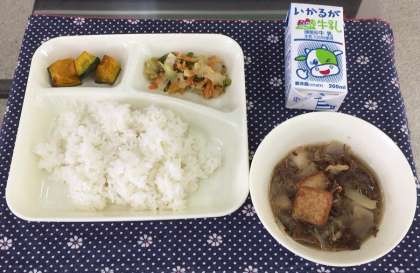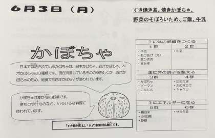 6月3日(月)、今日の給食の献立は『ごはん・牛乳・すき焼き煮・焼きかぼちゃ・野菜のそぼろいため』です。