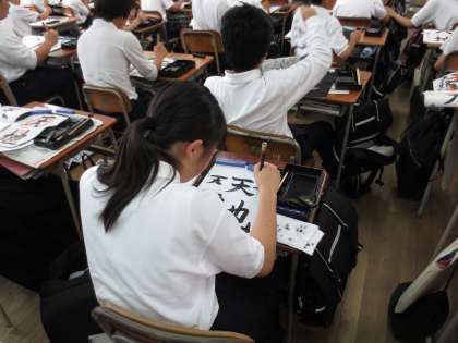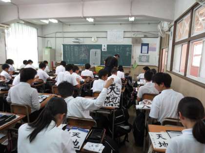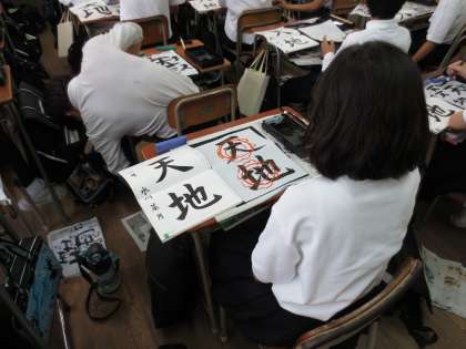 1年生の書写の授業の様子です。中学校学習指導要領によると、書写は国語の授業において履修させるよう定められています。本時は楷書(くずさない書き方)の学習です。まず楷書について教員から説明を受けた後、『天地』の2文字を毛筆で書くよう指示がありました。硯に墨をすり、半紙を用意したら早速練習に取りかかります。担当教員が机間を巡回し、朱色の墨で手直しをしたり、直接助言を与えたりしていました。みんな納得の1枚を完成できたかな。