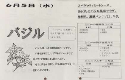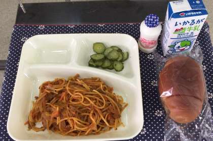 6月5日(水)、今日の給食の献立は『パン・牛乳・スパゲッティミートソース・きゅうりのバジル風味サラダ・発酵乳』でした。