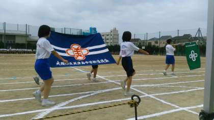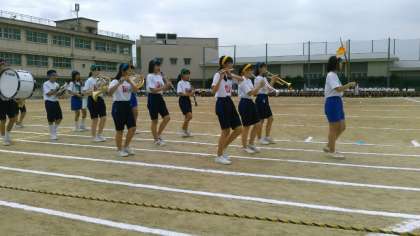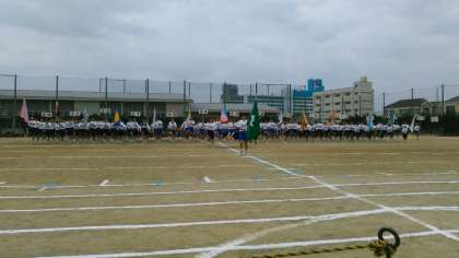 本日、体育祭を開催いたしました。生徒会役員(上段の写真です)、吹奏楽部(中段の写真です)の先導のもと、まずは堂々の入場行進です。クラスが気持ちをひとつにしながら、1年1組からから順に会場に入場します。全クラスが入場を終えたら、一斉に朝礼台に向かった行進です。(下段の写真)生徒集団の力強さや美しさが感じられる一コマです。
