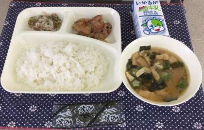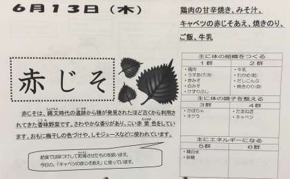 6月13日(木)、今日の給食の献立は『ごはん・牛乳・鶏肉の甘辛焼き・みそ汁・キャベツの赤じそあえ・焼きのり』でした。