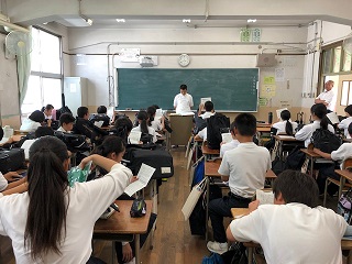 写真下段は、終学活で保健食育委員が『食育つうしん』の啓発活動を行っている様子です。1口30回以上よくかんで食べましょう。