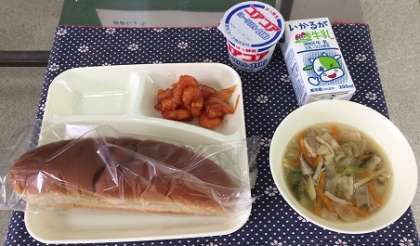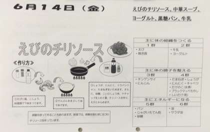 6月14日(金)、今日の給食の献立は『パン・牛乳・えびのチリソース・中華スープ・ヨーグルト』でした。
