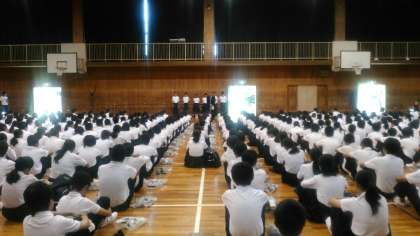 吹田市で発生した事件の犯人逮捕を受け、通常通りの課業を実施しています。写真は朝の全校集会の様子です。本日は教頭先生がお話をしました。ひとつは危機管理の話。自分の身は自分で守ることを例えて『いかのおすし「(ついて)いかない・(知らない人の車に)のらない・おおきな声を出す・すぐ逃げる・(大人に)しらせる)』を覚えましょうというお話です。もうひとつは、3年生就労体験にちなみ、「人はプライドを持って仕事に励んでいることを知りましょう。」というお話しでした。