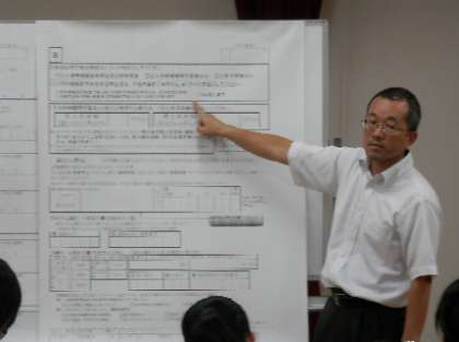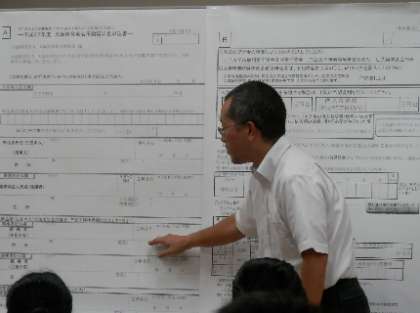 この申し込み書については、たくさんの記載事項があり、生徒が自筆で書く必要のある箇所と保護者が自筆で書く必要のあるところがあります。各家庭で準備していただく必要な添付書類等もあり、時間をかけて丁寧な説明を行いました。申し込み用紙の拡大版を使用し、進路指導主事より説明を行いました。生徒も熱心に聴きこんでいました。