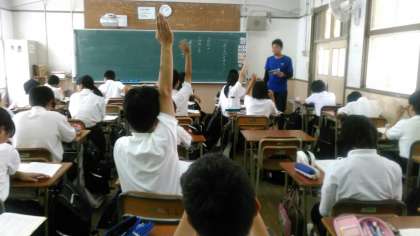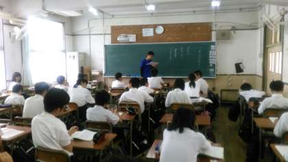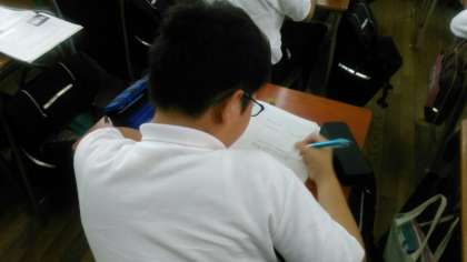 1年生道徳授業の様子です。本時は、『いつわりのバイオリン』という資料をもとに、自らの弱さや醜さを克服し、気高く生きようとする心について学習を深めます。資料では、主人公が弟子の作ったバイオリンを自らの作品として世に出し、名声を得たことへの悔悟の念が描かれます。そして自らの元を離れていった弟子に手紙をしたためるシーンで話が結ばれます。担当教員の問いかけに、生徒は意見を次々と発表していました。そして最後に、各自が主人公になりきって、弟子宛の手紙を完成させました。