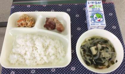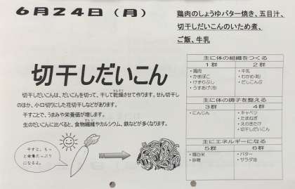 6月24日(月)、今日の給食の献立は『ごはん・牛乳・鶏肉のしょうゆバター焼き・五目汁・切干しだいこんのいため煮』でした。
