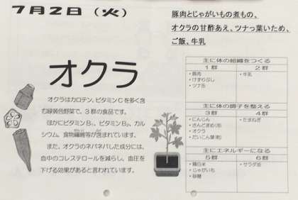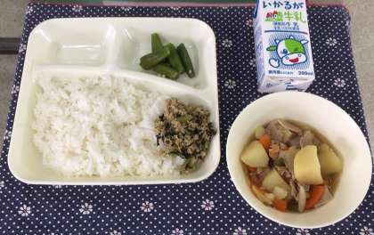 7月2日(火)、今日の給食の献立は、『ごはん・牛乳・豚肉とじゃがいもの煮もの・オクラの甘酢あえ・ツナっ葉いため』でした。