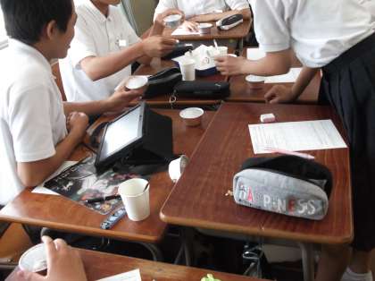 様々なだしを試飲し、タブレット端末などのICT機器を使って、「うま味」について学習しました。