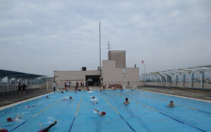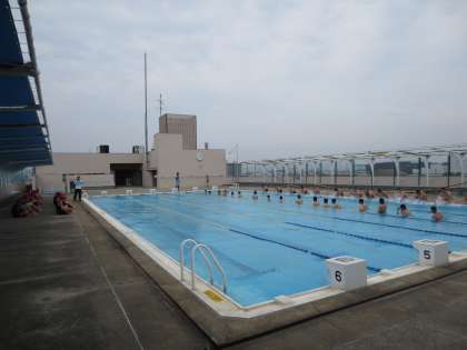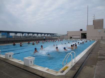 7月に入り、水泳の授業が始まりました。本校のプールは、十三筋に面した新館屋上にあるため、吹き抜ける風がたいへん心地よいです。(今日は、むしろ涼しいくらいです。)写真は2年生の授業の様子です。準備体操の後、シャワーを浴びてから徐々に水に親しんでいきます。身体が水に慣れたところで、25メートルを自由な泳法で複数回泳いでいました。(下段の写真)