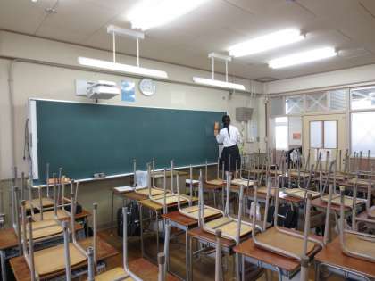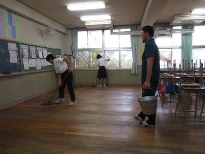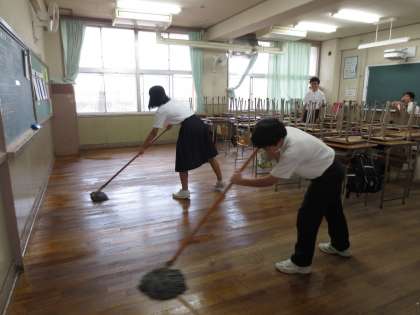 今日は、学期に一度の油ひき清掃の日です。いつもより念入りに掃き掃除をしたあと、床に油をまき、モップで均していきます。油をひいた前後で光沢の違いがお分かりいただけるでしょうか。明日からは、より美しい教室で学習に臨めそうですね。