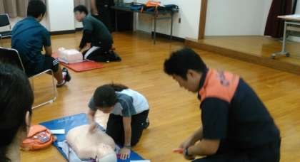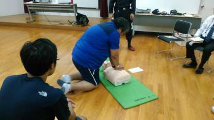 本日放課後、淀川消防の隊員の方をお招きし、教職員対象の「救急救命講習」を実施いたしました。DVDを視聴したのち、3班に分かれて、救急救命の練習に取り組みます。多くの教職員が本講習を既に受講したことがあり、意識を失った人への声のかけ方、周りのひとへの支援の要請、AEDの使用方法など、すぐに段取りがつかめていたようです。なお、本校は保健室とプールにAEDを備え付けています。