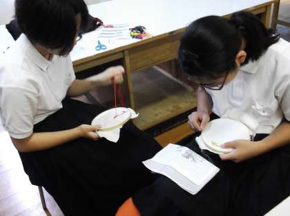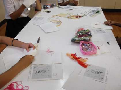 部員が2つに分かれて、作法室では『お点前』の稽古、被服室では『刺繍』を行いました。