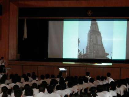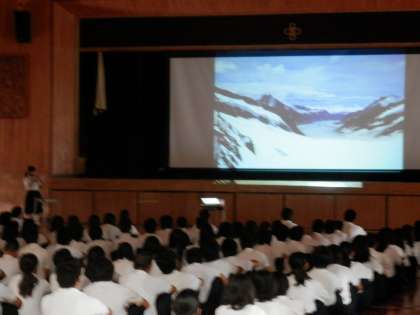 朝の学年集会で夏休み中の貴重な体験について、3年生の浅井さんに発表してもらいました。関西日本・スイス協会が主催する日本・スイス青少年交流使節団員として、スイスを訪問した時の様子について、写真を使っての紹介がありました。