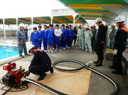 4人一組となって、指揮者、1番員、2番員、機関員の4人の動きで如何に早く、正確に放水できるかを体験し、学習しました。1回目はなかなかうまく操作できなかったのですが、ポイントごとにいろいろとアドバイスをいただいたことをシュミレーションし、2回目に挑戦した時は、随分スムーズに放水することができました。協力していただきました地域防災リーダーのみなさんと消防隊員の方々に感謝いたします。どうもありがとうございました。