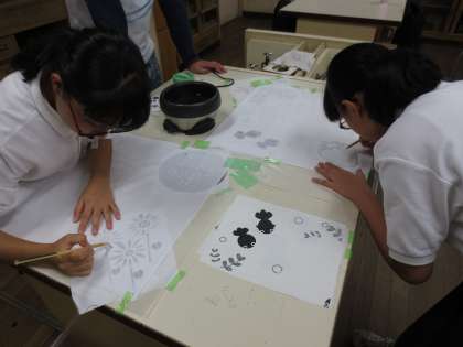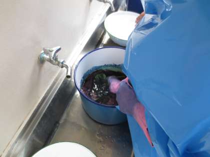 『美中・ザ・科学実験』に引き続き、理科の教員がプロデュースした藍染め講座です。白布に、溶かしたロウでデザインを描きます。ロウで塗った部分は藍に染まりません。藍を入れた缶で白布を丁寧にもみます。完成が待ち遠しいですね。