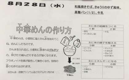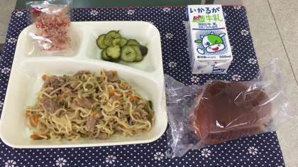 8月28日(水)、今日の給食の献立は、『和風焼きそば・きゅうりのゆず風味・黒糖パン(1/2)・牛乳』でした。