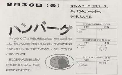 8月30日(金)、今日の給食の献立は『焼きハンバーグ・豆乳スープ・キャベツのソテー・ライ麦パン・牛乳』でした。
