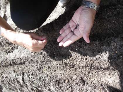 元気アップの皆様のご協力のもと、田辺大根の種をまきました。写真は、指の第一関節程度の深さの穴をあけ、5つの穴に1粒ずつ種をまいている様子です。