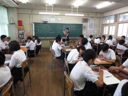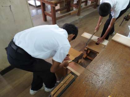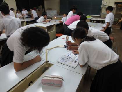 上段の写真は1年生理科。ガスバーナーの使い方について学んでいます。マッチを生れて初めて使う生徒もいるようです。全員無事点火することができました。中段の写真は1年生技術。木材加工の授業です。板に印を入れた後、のこぎりを使い切り落としていきます。木工室の椅子を固定台代わりに使用し、時間をかけてのこぎりをひいていました。下段の写真は2年生家庭科。来週以降に行う調理実習に向けて、班ごとに役割分担について相談しているところです。